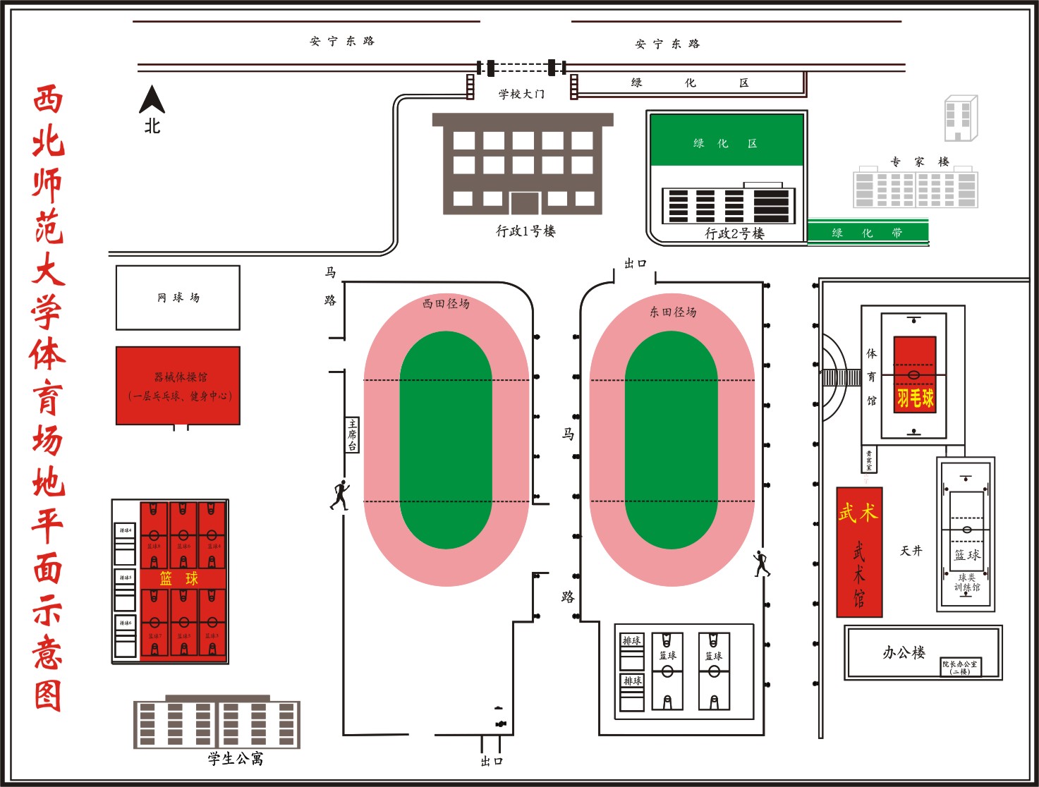 篮球(室内训练馆和室外篮球场)、排球(室外排球场)、足球、健步走、羽毛球(主体育馆)、网球、乒乓球(西体操馆一楼)、武术(武术馆)、健身健美(西体操馆一楼健身中心),场馆分布示意图见附件。