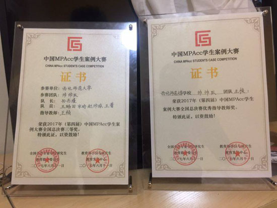 6月11日,2017年中国MPAcc(专业会计硕士)学生案例大赛(第四届)全国总决赛在中山大学举行。我校商学院张永丽、王桢、欧阳珍元老师指导,孙书瑾、赵帅琼、雷雨、王浩田、宋旸、王蕾等六名学生组成的“帅帅队”代表参赛并获第四名好成绩,王桢老师获得优秀指导教师奖。该代表队是西北赛区唯一一支晋级全国总决赛的队伍。
