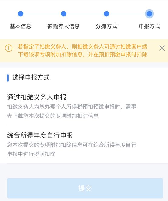 第三步:选择申报方式,如需由学校按月预扣税款时办理专项附加扣除,请选择“通过扣缴义务人申报”。