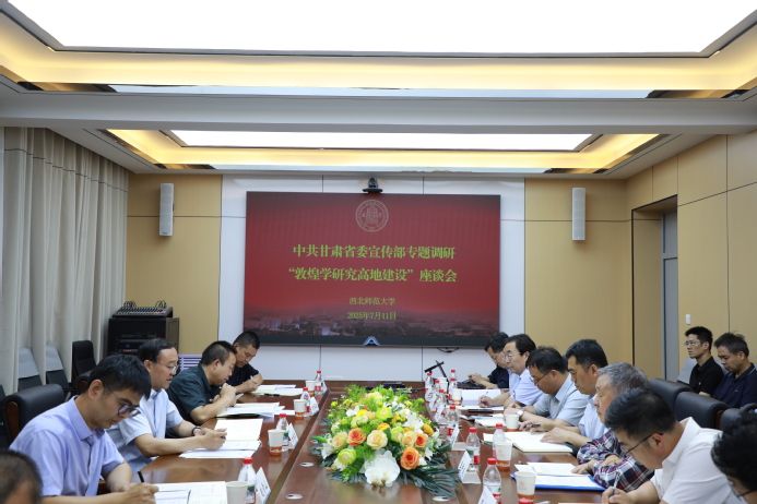7月11日上午,省委宣传部副部长甘博源一行来校开展甘肃省“敦煌学研究高地建设”专题调研。副校长马世年陪同调研并主持座谈会。研究生院、科学研究院、人事处、国际合作交流处、历史文化学院、美术学院、物理与电子工程学院负责人,学校敦煌学研究所负责人和学术骨干参加。