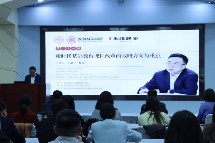 11月15日下午,“秉德讲堂”第二十一讲在西北师大云亭校区举行。西北师大杰出校友、首都师范大学教育学院教授、国务院特殊津贴专家、哲学社会科学领军人才、国家“百千万人才工程”国家级人选、原教育部基础教育司司长田慧生教授作专题报告。党委书记贾宁主持报告会并致辞。教育科学学院领导班子成员、教师代表及研究生、本科生200余人参加。